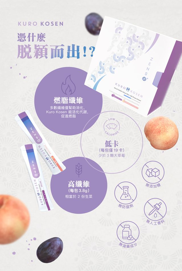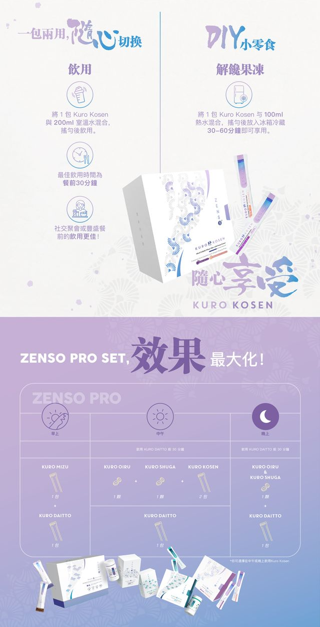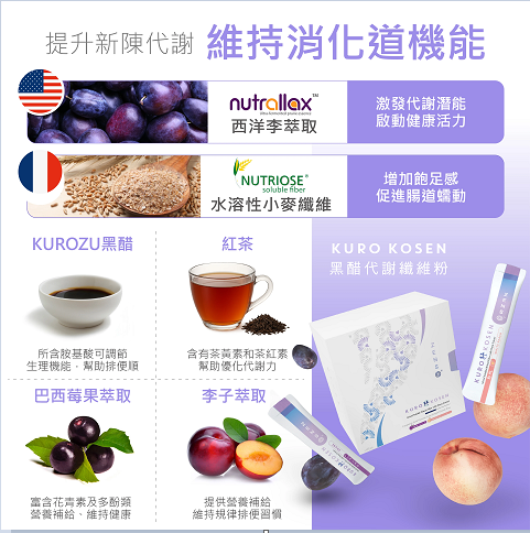 Kuro Kosen 係一款專為現代人研製嘅代謝調理飲品,融合咗日本百年黑醋、NUTRALLAX® 西梅萃取同紅茶多酚,以天然成分激活身體嘅燃脂機能,幫助提升基礎代謝、促進脂肪分解,同時有助維持腸道健康。長期飲用可支援體態管理,令身體狀態更輕盈自然。